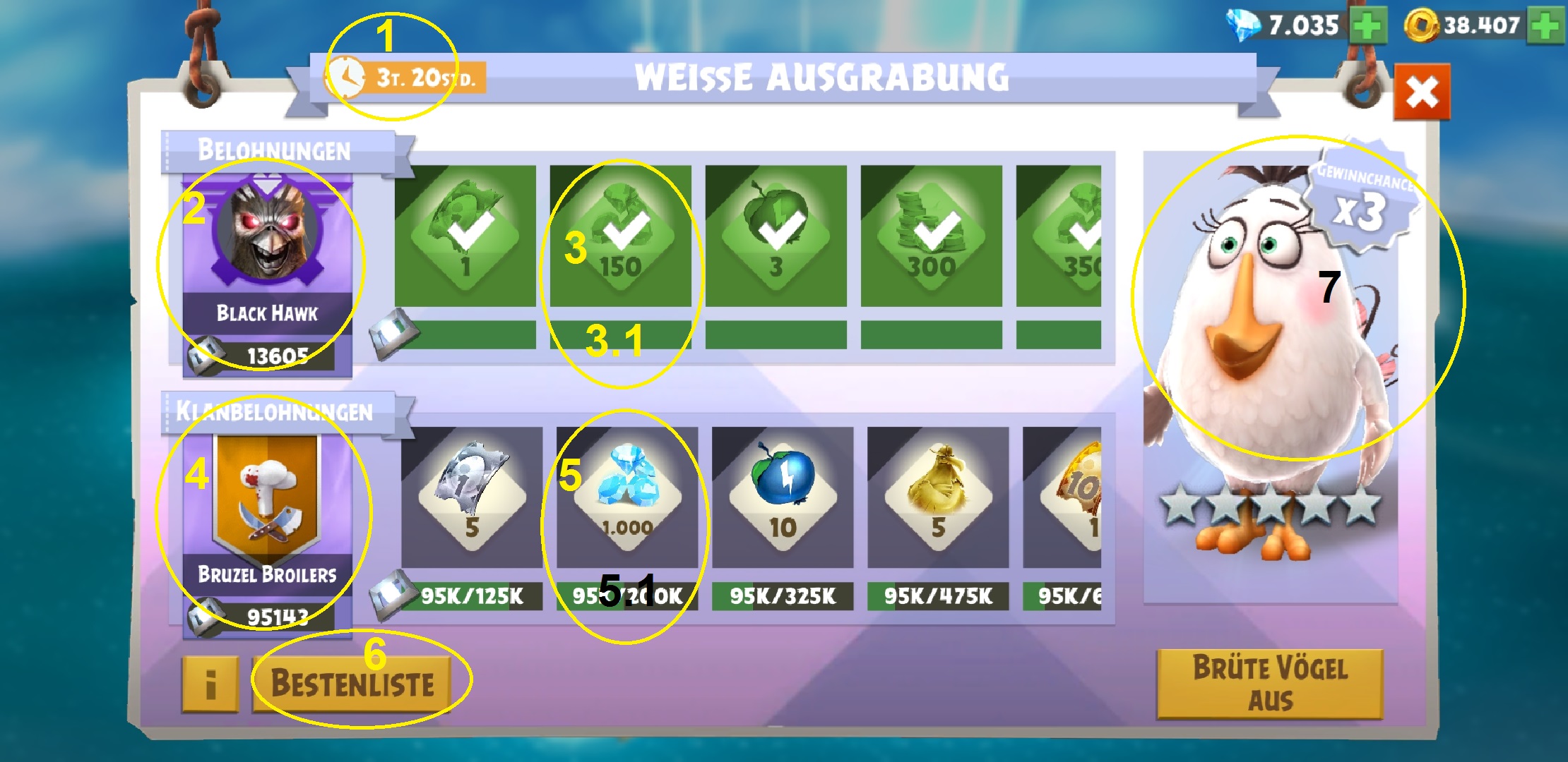 4. Die erspielten Klanpunkte, die Punkte aller Mitspieler des Klans werden hier addiert und bescheren Euch zusätzliche Belohnungen. Hier kann man auch draufklicken und sieht wer, wieviele Punkte gesammelt hat und wo man in der Rangliste steht.