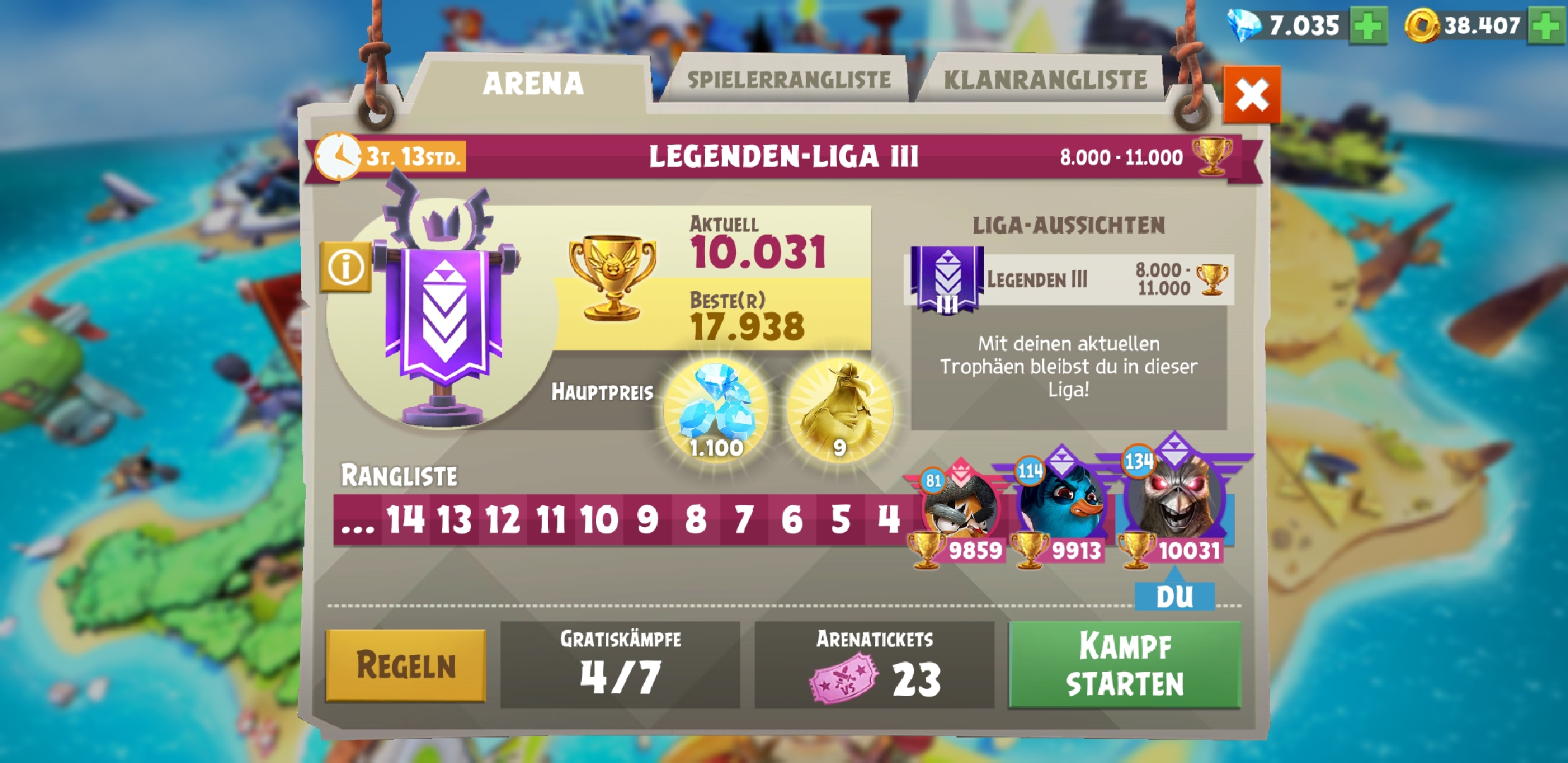 Hier mal nichts nummeriert, wir finden uns so zurecht.Oben drei Reiter "Arena/Spielerrangliste/Klanrangliste". Ausprobieren und selber lernen.